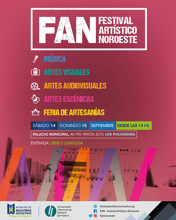Malvinas Argentinas, 13 de septiembre de 2019 – En el Palacio Municipal de Malvinas Argentinas, ubicado en Avenida Presidente Perón 4276, se realizará el Festival Artístico Noroeste, más conocido como FAN. Es organizado por la Universidad Nacional de General Sarmiento (UNGS) junto al Municipio, y se llevará a cabo los días sábado 14 y domingo 15, a partir de las 14 horas, con entrada libre y gratuita.