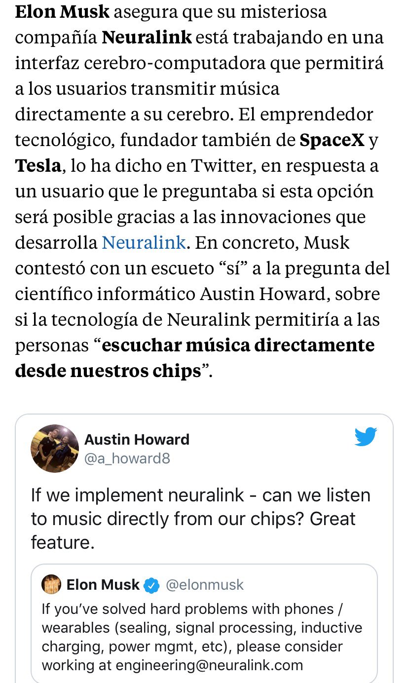 Elon Musk asegura que su misteriosa compañía -NEURALINK- está trabajando en una interfaz cerebro-computadora que permitirá a los usuarios transmitir música directamente a su cerebro.