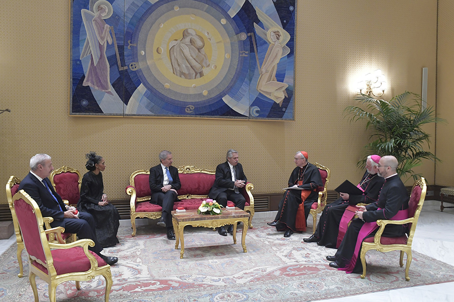 Finalmente, Fernández mantuvo, junto a Solá, Oliveri y Silva, un encuentro con el secretario de Estado de la Santa Sede, el cardenal Pietro Parolin, quien estaba con el secretario para las Relaciones con los Estados el arzobispo Paul Gallagher.