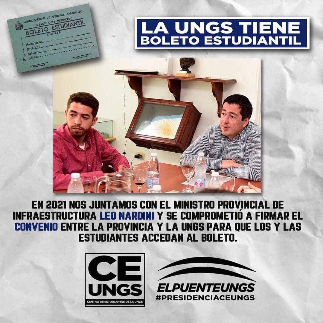 Con la llegada de Leo Nardini al Ministerio de Infraestructura y Servicios Públicos de la Provincia de Buenos Aires, y tras una reunión con representantes de la agrupación estudiantil 'El Puente', desde la presidencia del Centro de Estudiantes de la UNGS, comenzó a encaminarse el reclamo. El Boleto Especial Educativo será de carácter gratuito para los estudiantes de la UNGS, a partir del ciclo lectivo 2022. Se trata de una promesa cumplida en el plazo de dos meses, que el ministro les había hecho a los estudiantes a finales del 2021. “Hoy, gracias a la intervención del Ministerio de Transporte de la provincia de Buenos Aires y las gestiones realizadas desde hace un tiempo por el ministro de Infraestructura y Servicios Públicos, Leo Nardini, y al aval del gobernador Axel Kicillof, podemos celebrar esta gran noticia”, concluyó el senador.