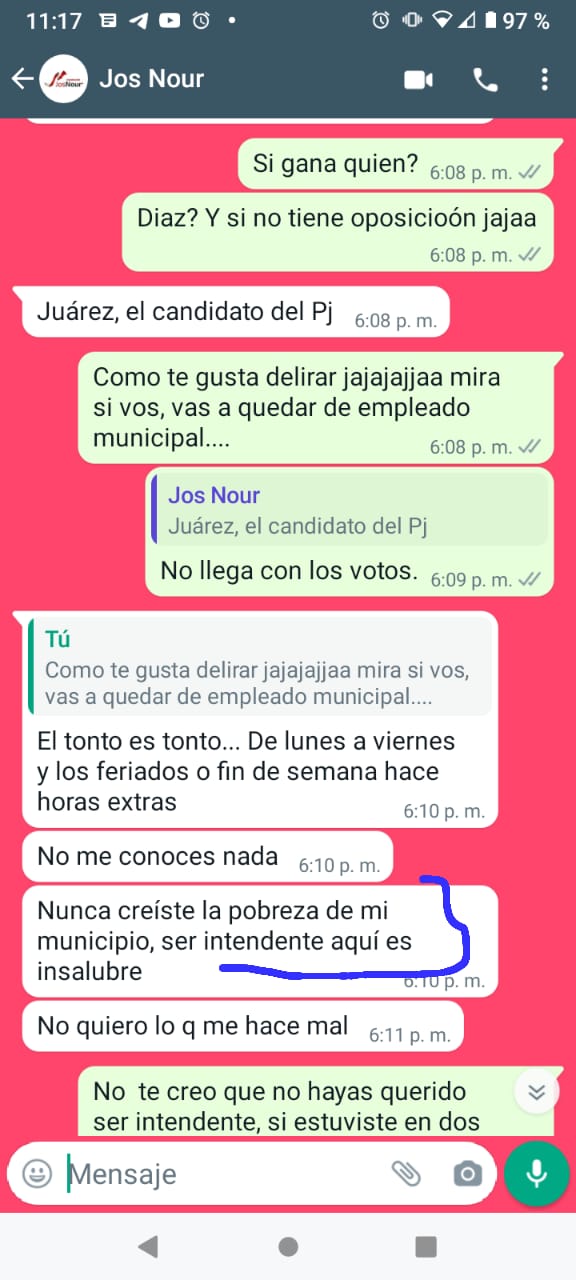 Esa fue la declaración que hizo el actual intendente de San Pedro de Guasayán en un chat. José Nour ¿ te parece que ya es hora de que San Pedro de Guasayán tenga un Intendente con ganas de trabajar por el pueblo y no para el beneficio de amigos y familiares? Mire usted la contradicción que tiene, dijo que su municipio es pobre en un chat con fecha 11 de junio 2022 y este 15 de julio el mismísimo Nour publicó que agradece al gobernador por los más de 50 millones para concretar obras públicas y que nunca empezó. ¡Vaya contradicción! Mentir que el municipio no tiene recursos, es un acto de absoluta traición al gobernador de los santiagueños, traición al máximo referente que trabaja día a día para mejorar la calidad de todo el territorio provincial.