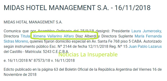 Dicho hotel es propiedad de la firma Midas Hotel Management S.A., cuya Directora Titular no es otra que Ximena Vallarino Alfaro Diaz Alberdi, media hermana del Jefe de Gobierno Horacio Rodríguez Larreta a través del segundo matrimonio de su madre, María Cristina Díaz Alberdi, con Gaspar Emilio Vallarino Alfaro.