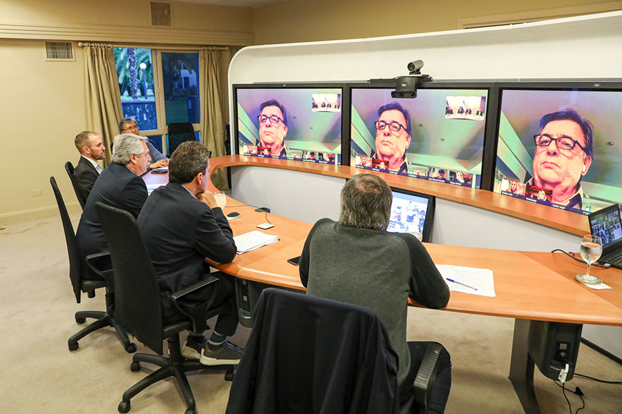El presidente Alberto Fernández encabezó esta tarde una videoconferencia con los presidentes de bloques de la Cámara de Diputados, con quienes analizó las medidas que lleva adelante el Gobierno nacional en el marco de la pandemia de coronavirus COVID-19. Está acompañado por el ministro de Economía, Martín Guzmán; el presidente de la Cámara, Sergio Massa; el titular del bloque del Frente de Todos, Máximo Kirchner, y el secretario de Relaciones Políticas y Parlamentarias, Fernando Navarro.