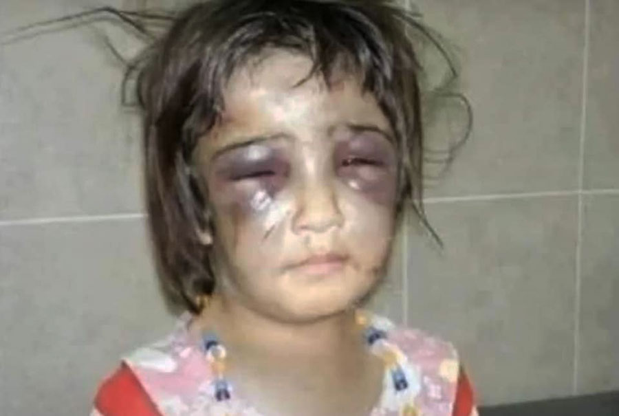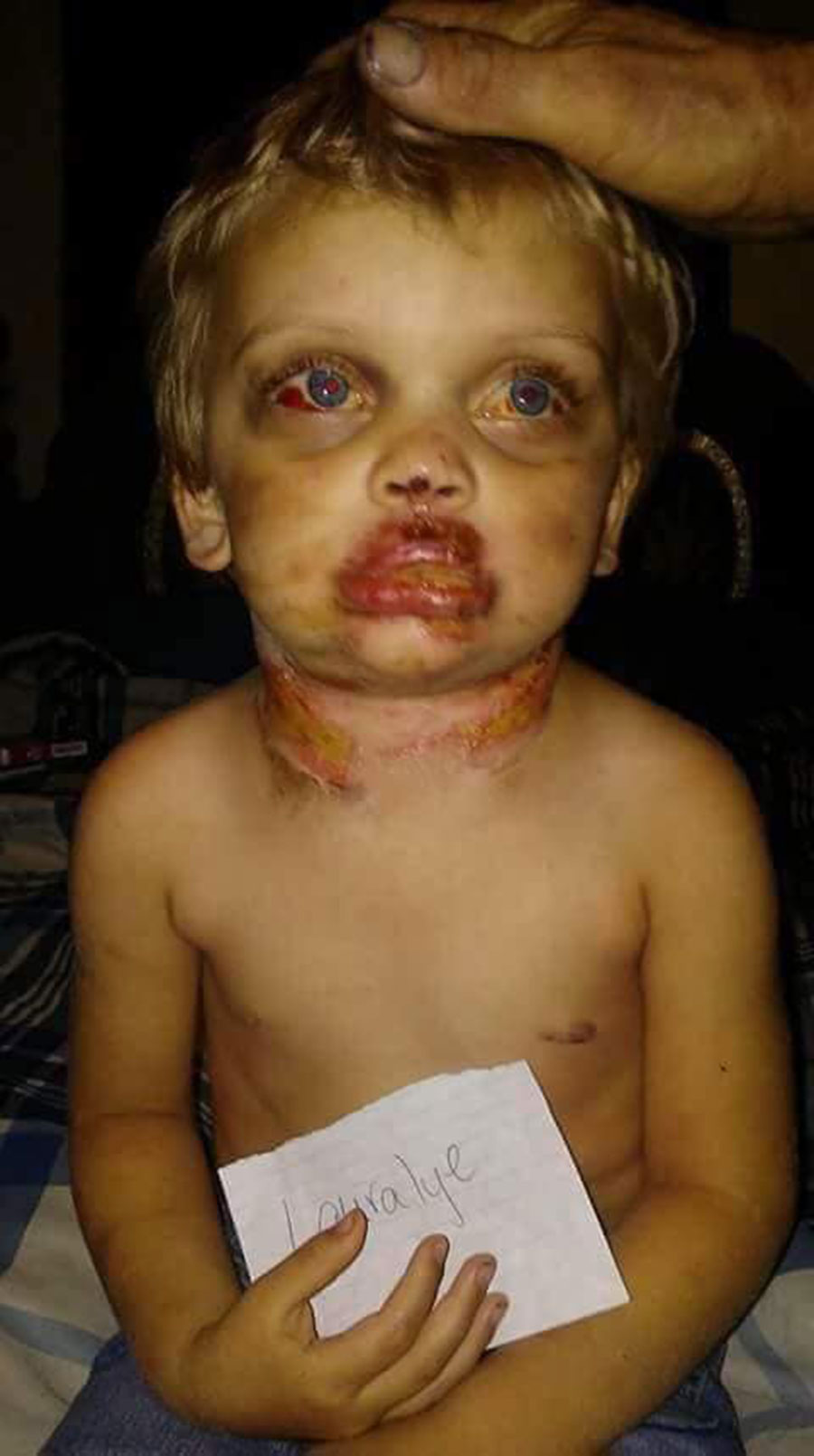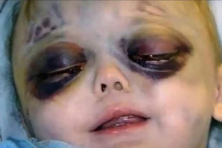 Las secuelas de este abuso ritual satánico es lo que se llama Ojos de Panda, ya que los vasos sanguíneos aparecen dentro de sus ojos de llorar implacable y quizás también por abuso físico.