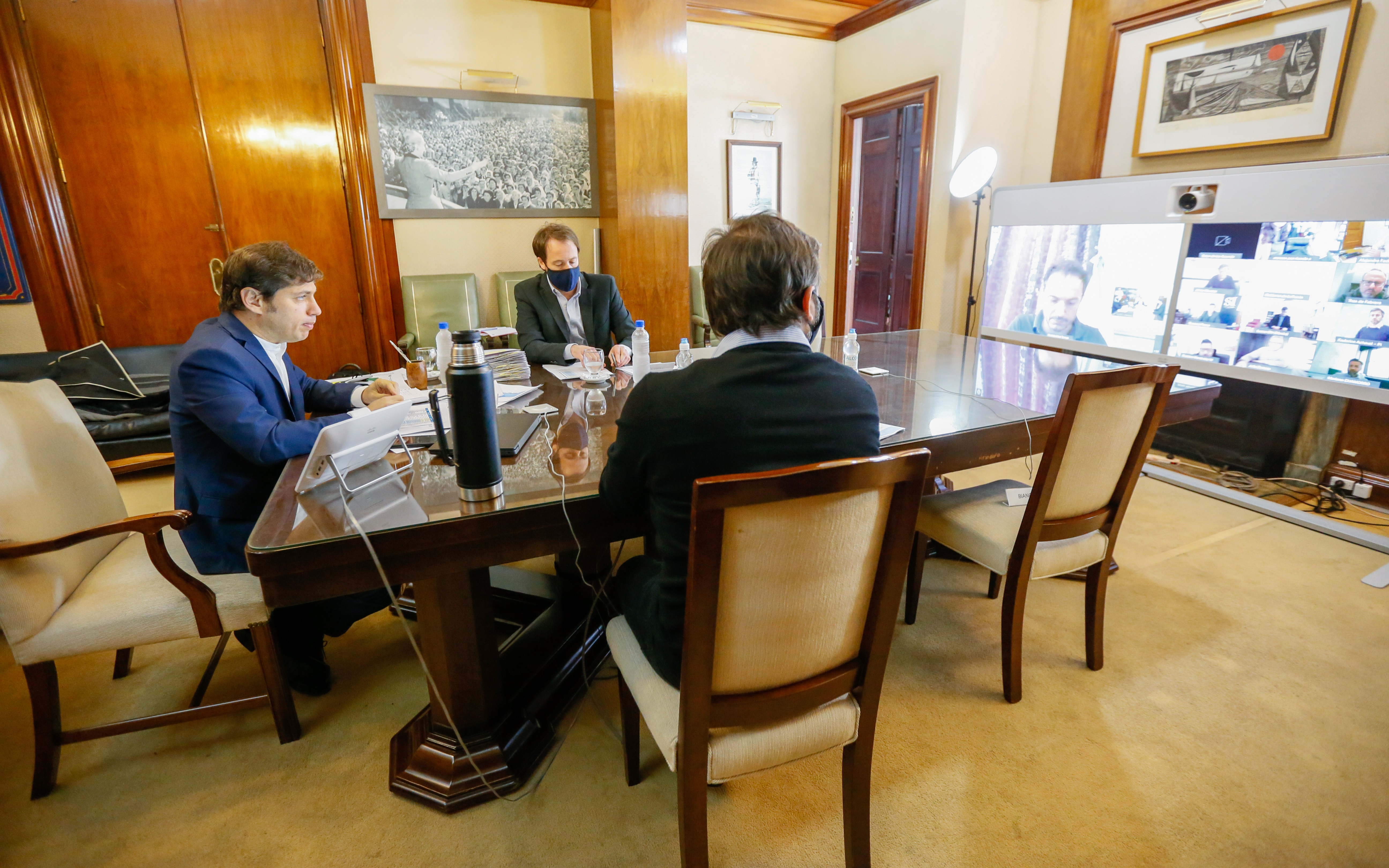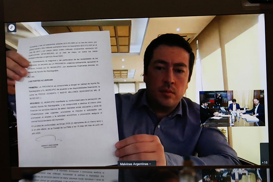 El gobernador de la Provincia de Buenos Aires, Axel Kicillof, y el ministro de Hacienda y Finanzas, Pablo López, encabezaron este martes la firma de convenios de asistencia financiera con los intendentes de la primera, tercera y octava sección electoral, para dotar a los municipios de mayores recursos y menguar el impacto financiero de la pandemia. Durante la suscripción de los convenios, que se realizó vía teleconferencia, estuvieron también presentes el jefe de Gabinete, Carlos Bianco, y la ministra de Gobierno, Teresa García.