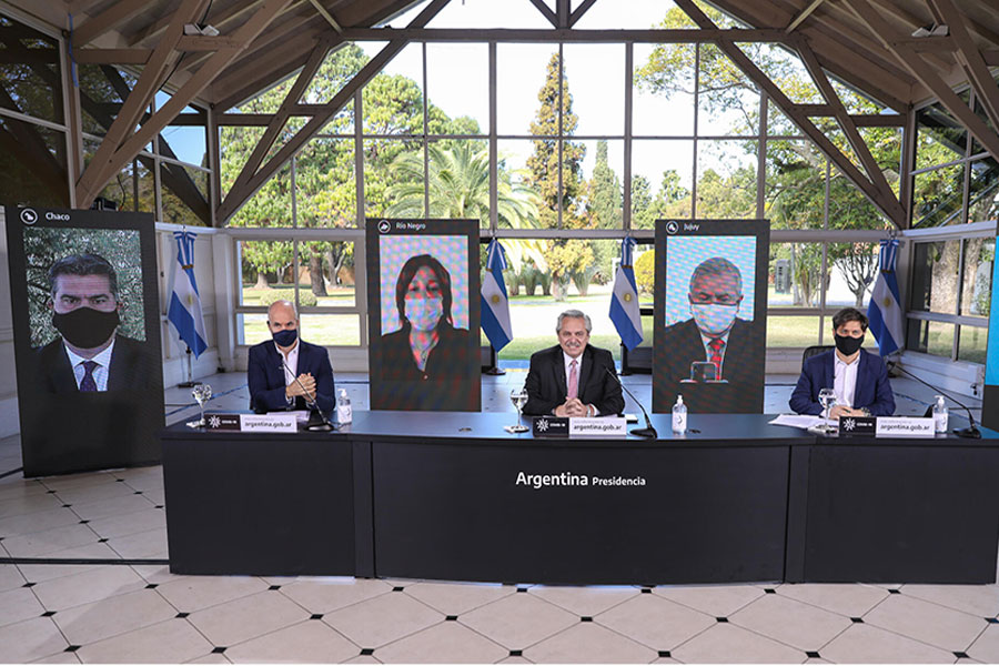 Lo hizo desde la residencia de Olivos acompañado por el gobernador de la provincia de Buenos Aires, Axel Kicillof; y el jefe de Gobierno porteño, Horacio Rodríguez Larreta; además de los gobernadores de Chaco, Jorge Capitanich; Río Negro, Arabela Carreras; y Jujuy, Gerardo Morales, quienes estuvieron presentes en forma virtual mediante videoconferencia.