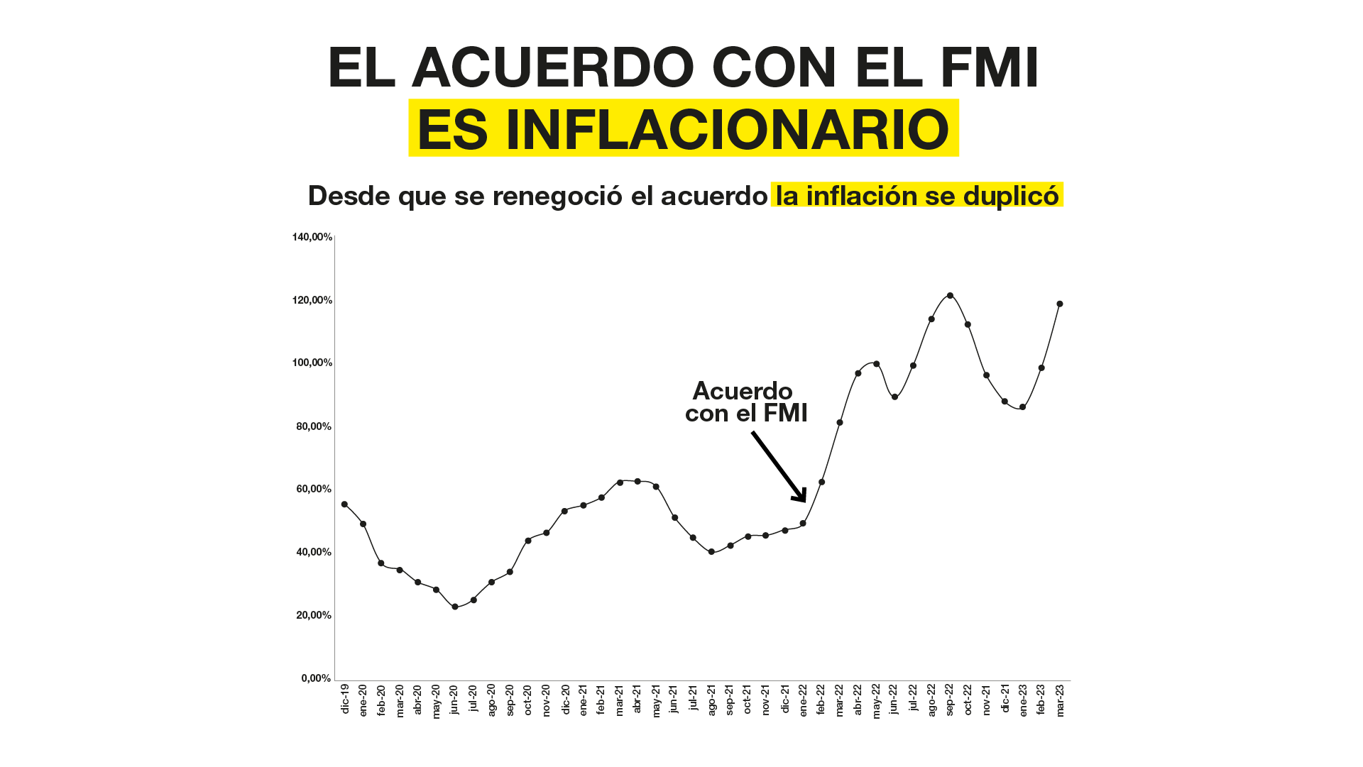 Porque es una política enlatada. Enlatada que se aplica como una receta monotemática a todos los países. Y quisiera que pusieran un poquito el gráfico de… Ahí está. Fíjense: el acuerdo con el FMI es inflacionario. Fíjense el momento en que se firma el acuerdo y fíjense cómo se dispara la inflación a partir de la firma del acuerdo cuando se pierden herramientas y entonces tenemos que la tasa de devaluación tiene que acompañar a la inflación en un país de economía bimonetaria como el nuestro donde el principal causante de la disparada de los precios es la variación del dólar. Es algo que no les entra a los técnicos del FMI en la cabeza porque, también, admito que es difícil entendernos a los argentinos. Concedamos un poquito también que somos muy especiales. Ya se los dije en la charla magistral en Chaco. Aquel famoso premio nobel que dijo que hay cuatro tipos de economía: desarrollados, subdesarrollados, Japón y Argentina. Esto es así. Entonces se quieren aplicar políticas enlatadas que además, no solamente en Argentina, en realidad las políticas del FMI no han dado resultado en ninguna parte. No hay un modelo exitoso. Miren: y acá me vengo a acordar de otra cosa. ¿Saben quién fue el que más apoyó la convertibilidad y puso al que entonces era Presidente y lo aplaudieron en una asamblea del FMI? Bueno, al autor de la convertibilidad. Eso sí fue apoyado por el FMI. Miren cómo terminamos: un gobierno constitucional voló por los aires, cinco presidentes en una semana, muertos en las calles de la Ciudad de Buenos Aires. Represión, miseria, dolor. Entonces creo que es necesario revisar esas cláusulas. Ese acuerdo. Me dicen. Dicen ¿no? que en el FMI hay halcones y palomas. ¿Halcones y palomas? Igual que acá en la oposición, estamos llenos… Hay halcones y palomas por todas partes. A mí me cuesta entender la lógica de los halcones y las palomas porque como yo soy pingüina, soy un ave pero… Y sí, porque vieron que los halcones y las palomas vuelan solos. Son solitos, individualistas. Los pingüinos somos todos colectivos. Vieron que somos todos juntitos, vamos para acá, para allá, somos muy colectivos. Entonces me cuesta… me cuesta.