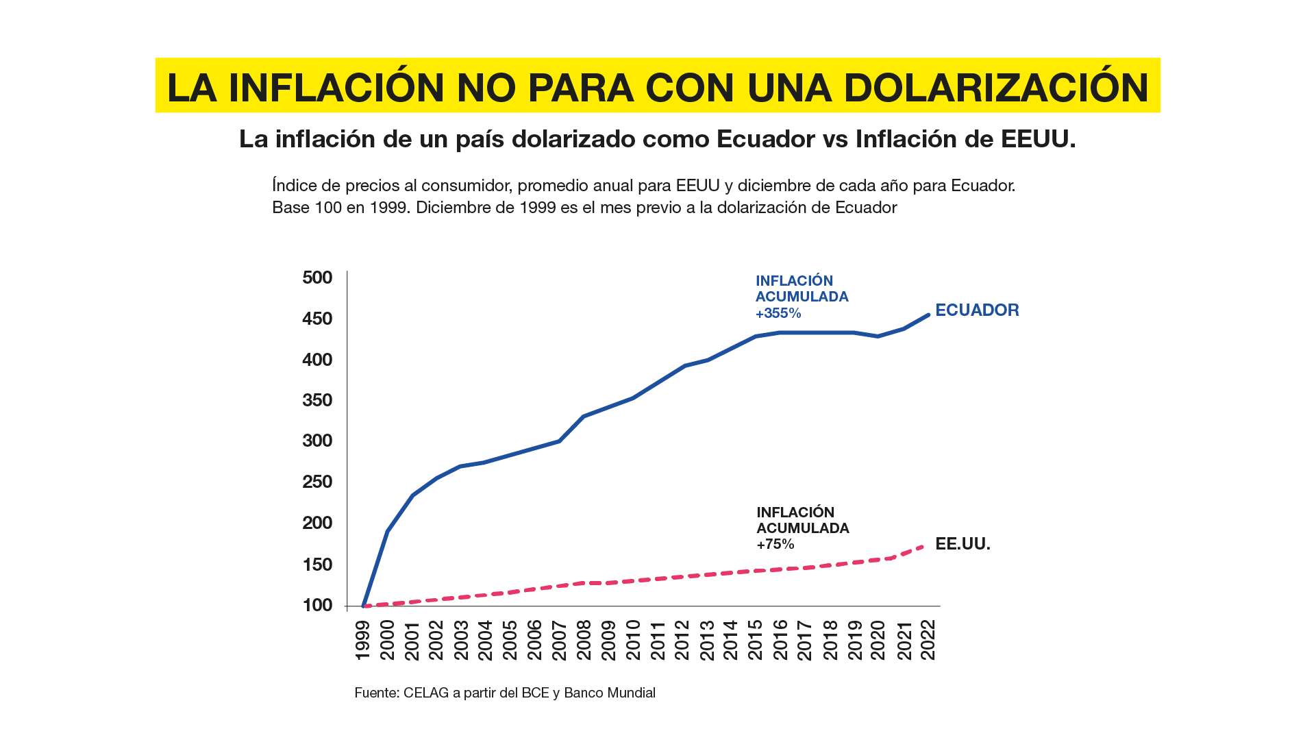 La inflación no para por una dolarización, fíjense, la línea superior con una inflación acumulada de 355 en el período del 99 al 22 frente a una inflación del 75% en Estados Unidos. La inflación sigue, peor no solamente eso. La segunda lámina, por favor, de Ecuador.