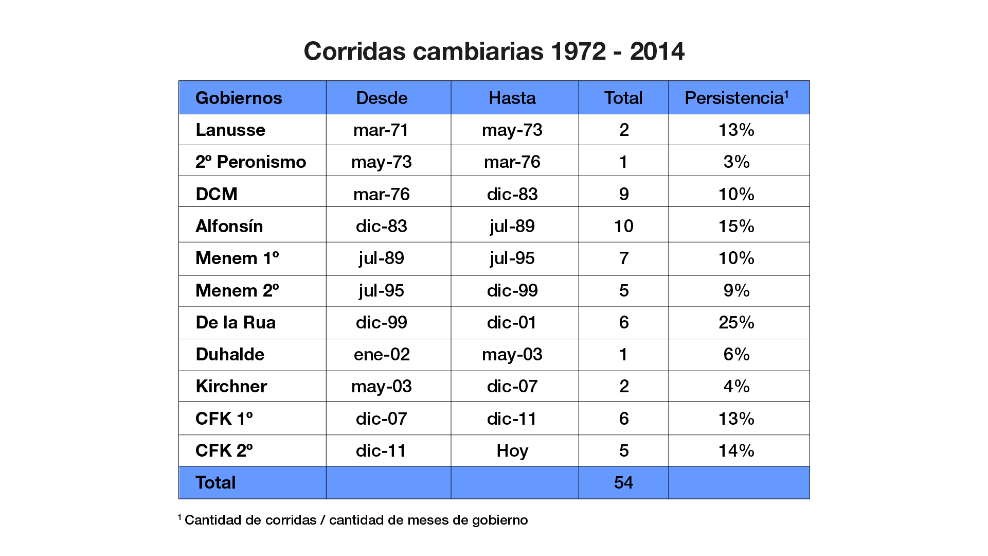 Esta es la historia de las corridas cambiarias en la República Argentina del 72 al 2014. Pueden ver la persistencia que es la última columna se da, fundamentalmente, por los tiempos en los cuales dura la corrida. Bueno, la corrida… a mí, por supuesto, fuera de la de Alfonsín que fue fuerte también. Nosotros tuvimos seis corridas en el primer mandato y cinco en el segundo. ¿Y por qué? Pero no se enteró nadie. ¿Cómo que tantas corridas cambiarias? Dos cuestiones: ¿por qué no se enteraron? Porque no impactaron en los precios con esta locura de que “cierro, que no hay” que almacenan. Primero porque el mercado, el Banco Central interviene en la administración del tipo de cambio. Esto no se podía hacer hasta esta semana cuando se tomó la decisión de hacerlo porque el acuerdo con el Fondo prohibía que el Banco Central interviniera en el mercado cambiario para evitar una corrida. Está prohibido por el acuerdo con el Fondo. Parte de las discusiones que tuvo el anterior ministro no fueron conmigo ni por mí. Fueron, precisamente, por esta situación del Banco Central que no intervenía no solamente acá sino en otras situaciones como, por ejemplo, sentarse sobre las reservas porque la otra cuestión es, no solamente intervenir en el mercado cambiario sino poder hacerlo porque el Banco Central tiene reservas. Miren que me golpearon, corrieron y no teníamos tampoco acceso a los mercados internacionales. Pero con las reservas, sentada sobre las reservas… Sí, sentada sobre las reservas, con la administración del tipo de cambio, con la regulación, pudimos sofocar corrida cambiaria. No, no se trata de una persona. Es necesario volver a construir programas de gobierno. Es necesario que vuelva a depender de una persona.