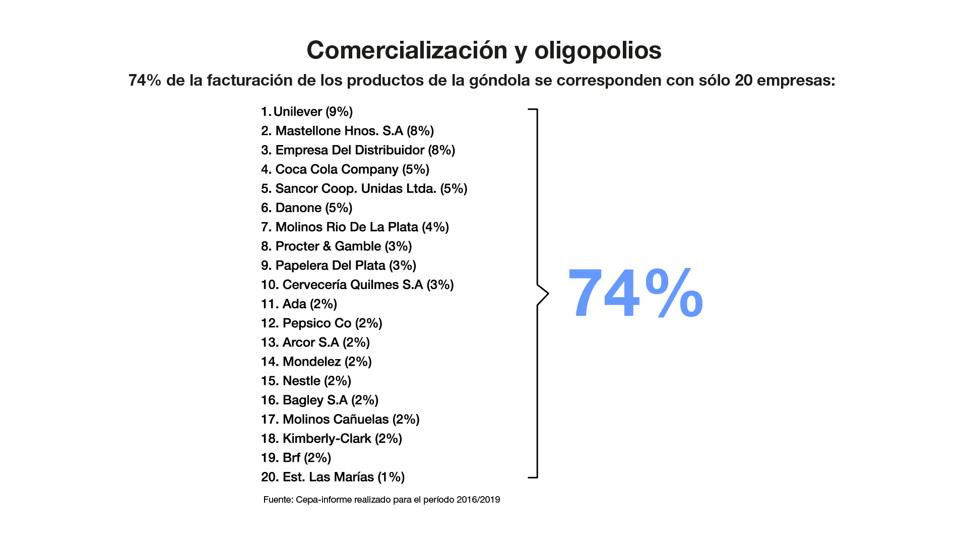 miren, ahí tenemos las principales veinte empresas, esas veinte empresas que figuran ahí -porque hay que empezar a hablar con nombre y apellido- Unilever, Mastellone, Coca Cola, Sancor, Danone, Molinos, porque si no parece que los precios los remarcaran Cristina, Nicolás… no, no. Estas veinte empresas hacen el 74 por ciento de la facturación de lo que vos comprás en la góndola. Bueno, atomizado, lo que se dice atomizado, el mercado no estaría. En algunos casos, como en el caso de la leche, por ejemplo la leche por sachet, que es la que consumen los sectores populares, el 90 por ciento la produce una sola empresa, La Serenísima, Mastellone. Una sola. Los fideos poné los fideos que llegaron todos, la empresa Molinos, después de haberle comprado la unidad a Mondelez, maneja el 50 por ciento del mercado de fideos en la República Argentina. Entre Arcor y Mondelez el 60 por ciento en galletitas. Bimbo, que es de los mexicanos, el 80 por ciento del pan. Coca Cola, bueno, ya sabemos. La cerveza lo mismo. Y en otros insumos difundidos como el polietileno, Dow Chemical, cien por cien. Aceros planos, cien por cien Techint. Y así podríamos seguir enumerando el grado de concentración de la economía. Y frente a estos sectores concentrados -es un fenómeno global la concentración, esto no es crítica, es descripción- frente a poderes económicos cada vez más concentrados, una política, un Estado cada vez más fragmentado, más dividido y más enfrentado. ¿A quién le van a hacer creer los políticos hoy, cualquiera sea el origen, la idea, que van a poder controlar lo que hace el poder económico concentrado, y que van a solucionar los problemas de los argentinos, en este estado de cosas. Que no me jodan. Que no me jodan más con esas fantasías. Acá la única, y quiero (no, no, presidenta no)… miren, acá no es casualidad que la única dirigente política que fue condenada, proscripta, inhabilitada e intentada asesinar es una sola, y no quiero ser autorreferencial. Esos mamarrachos que andan diciendo que «la casta tiene miedo», ¿de qué tiene miedo? si nunca te pasó nada, hermano. Que me venís a joder con que te tenemos miedo, de dónde te tenemos miedo. ¡Caraduras!. Es increíble, perseguida, mis hijos, me quisieron matar… No quieren investigar a quienes me quisieron matar y tienen evidentes compromisos con sectores empresarios de la República Argentina. Miedo tengo, saben por qué… porque mis nietos puedan crecer en un país tan injusto, tan inequitativo, a eso sí le tengo miedo. Yo ya viví, ya di lo que tenía que dar, yo ya viví. Temo por los jóvenes, temo por los pibes, porque hay demasiada cobardía, hay demasiada hipocresía, y esto es lo que está pasando en la República Argentina. Y quiero, finalmente, decir que es necesario que vuelva a haber en la República Argentina un programa, tenemos que hacer un programa de gobierno en donde discutamos estas cosas de las cuales estuvimos hablando hoy. No hay que pelearse, y tampoco un programa donde hagamos fe, anticapitalista y nada por estilo. Vuelvo a repetir lo que ya he dicho en muchas oportunidades, hoy el capitalismo ya no es una ideología, es simplemente el modo de producción de bienes y servicios más eficiente. Miren, se vienen momentos en el mundo donde vamos a tener que estar preparados para grandes cambios. La gran discusión no va a ser si el capitalismo sí o el capitalismo no, sino quien conduce los procesos de producción para no dañar tanto el medio ambiente, para que haya mayor igualdad. Si los dejamos a los mercados o el Estado, la política, vuelve a tomar la dirección. Esto es lo que decía Perón. Miren la evolución de este capitalismo financiero alejado de la realidad, que hoy quién es el hombre más rico del mundo ¿lo saben? Cuando el capitalismo significaba que el dinero, para reproducirse, debía pasar por el circuito de producción de bienes y servicios, y no solamente en lo financiero, el hombre más rico podría ser Henry Ford, porque vendía autos y era innovador tecnológicamente. Más tarde fue el dueño del petróleo, Paul Getty, porque era la energía. Después fue Bill Gates porque fue la innovación tecnológica, la tecnología. Hasta hace poco era Ellon Musk, que es también tecnología y todo eso. ¿Saben quién es hoy el hombre más rico del mundo? Un francés, Bernald Arnault, que es el dueño de las marcas de lujo que le vende a los ricos del mundo. Es el dueño de Gucci, de Christian Dior, de Tiffany, de todas las marcas de lujo. Esto significa una modificación y una profundización de la concentración del ingreso; nada bueno puede salir de eso finalmente. Y vamos a una discusión de esto en el mundo que viene. Viene un mundo diferente. Miren, cuando uno ve que los saudíes se dan la mano con los iraníes y en el medio hay un chino, empiecen a abrir los ojos, algo está pasando. Algo está pasando, que no estamos viendo. Y por favor… porque ya mañana, Clarín pone «Cristina, los iraníes con China, se descubrió… el complot era con China, los iraníes y los saudíes, no, por favor»… me arman una nueva causa, seguro, en cualquier momento. No, es el mundo nuevo. El mundo se cayó con el crac del 30, cuando se cayó el patrón oro y fue sustituido por el patrón dólar. Ayer el ministro estaba firmando con China el intercambio, nuestro principal socio comercial, China, y Brasil. Ayer el ministro estaba firmando con China el acuerdo para que todos lo que importamos de China lo paguemos con yuanes y podamos utilizar el SWAP que tenemos, que fue concedido cuando yo era presidenta, a partir de que firmamos el acuerdo estratégico con Xi Jinping en el año 2015. Entonces creo que es necesario que abramos los ojos como decía Nicolás. Van a pasar y están pasando cosas nuevas, tenemos problemas nuevos. No podemos tener la cabeza tan vieja, de seguir discutiendo estupideces. No podemos tener la cabeza tan vieja, las nuevas generaciones se merecen que tengamos l