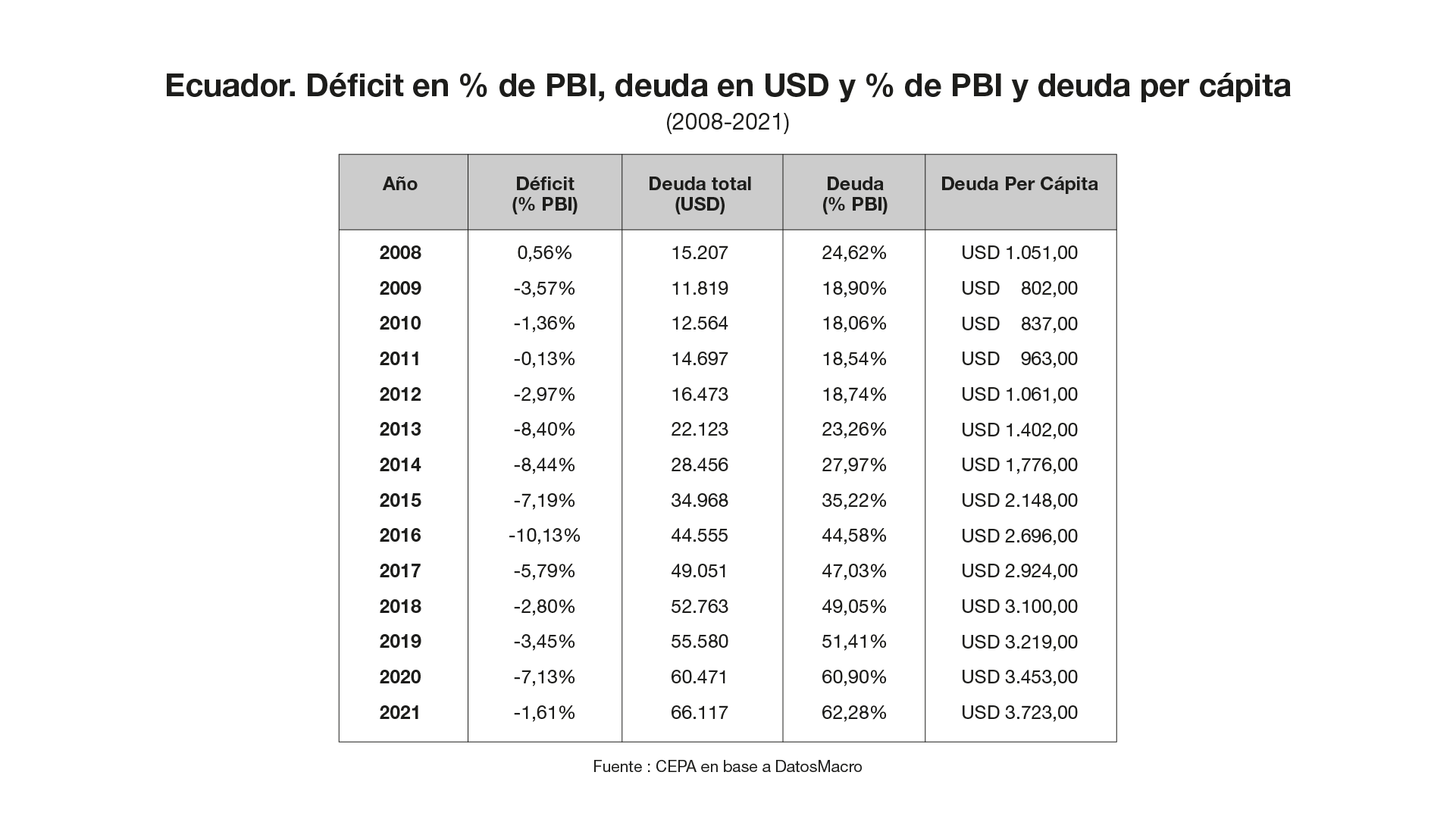 Si se puede ver, esta es la evolución de la deuda desde el año 2008 al 2021, Ecuador empieza con una deuda en PBI que representa el 24,62% y hoy está en 62,28%. ¿Por qué? Porque como no emite moneda, su moneda es el dólar, cuando se endeuda tiene que hacerlo a través de endeudamiento externo, no hay posibilidad de que tenga política monetaria, como por ejemplo la tuvimos cuando el tema del COVID, donde sin acceso a los mercados de capitales, la Argentina emitió para poder hacer frente a los gastos que significaba vacunas, salud, etcétera, etcétera. Claro que eso, una emisión de 8, 9 puntos del PBI provoca un proceso inflacionario, como pasó en todo el mundo, como también pasó en el 2008 en la crisis de Lehman Brothers. Porque la emisión, todo tiene que ver con todo, la emisión de los bancos centrales europeo o de la Reserva Federal, cuando fue para fondear a todos los bancos que quebraron por las hipotecas en el 2008, nadie dijo ni pío, ¡nada! Cuando se emite para los bancos parece que eso no produce inflación.