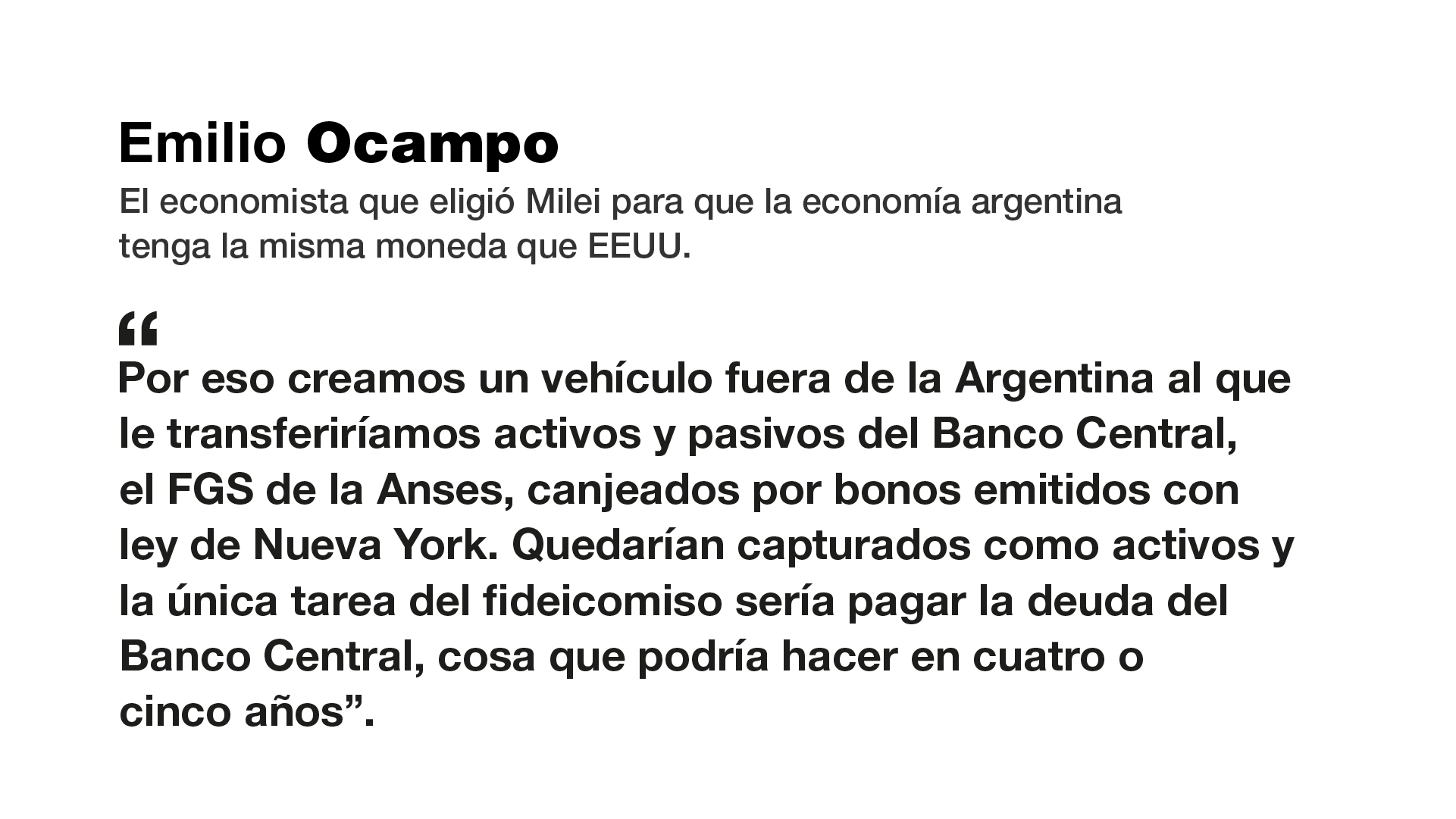 Yo sustraje del reportaje la parte donde explica cómo va a hacer para sin tocar la plata de nadie, ni sacarle nada a nadie, cómo va a hacer para sustituir el circulante, los pasivos del Central, etcétera, etcétera. Sin tocar nada. Y dice «por eso creamos un vehículo fuera de la Argentina al que le transferimos los activos y pasivos del Banco Central», el Banco Central tiene pasivos y activos, «el FGS del Anses», aaah! ¿Cómo? Ah bueno el FGS del Anses, ¿cómo que quieren transferir el Fondo de Garantías de los jubilados? ¿Qué tiene ese Fondo de Garantías de los jubilados? Bueno, tiene muchos bonos, pero tiene otras cosas. La próxima, por favor.