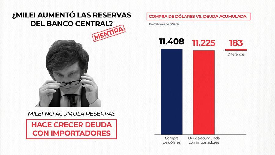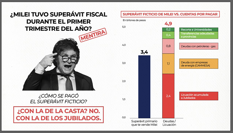 ¿Cómo se explica el supuesto superávit? Básicamente, con deudas impagas y licuación de ingresos de los sectores trabajadores y jubilados. Milei acumula 9 mil millones de dólares de deuda impaga a importadores y 2 mil millones a energéticas.