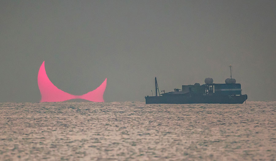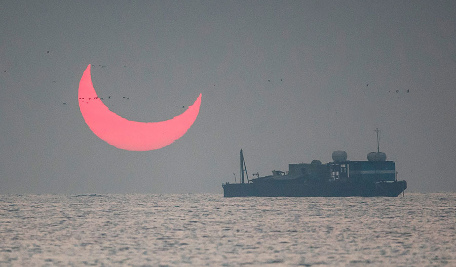 Un sol parcialmente eclipsado sale del mar en Al Wakrah, Qatar, 26 de diciembre de 2019.